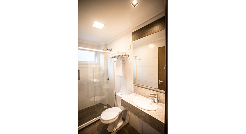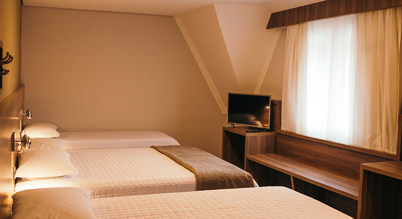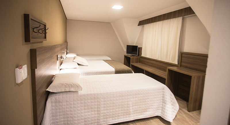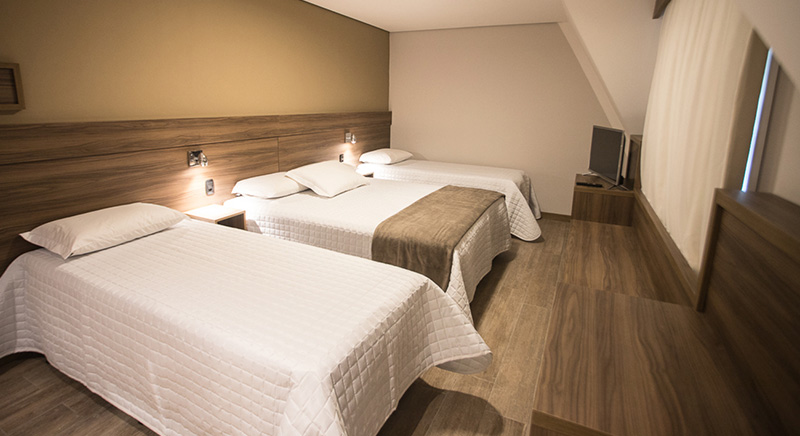 O quarto Quádruplo Luxo acomoda quatro pessoas, sendo uma cama de casal e duas de solteiro podendo ser sofá-bicama. Esse quarto também permite adição de berço gratuitamente, mediante solicitação.