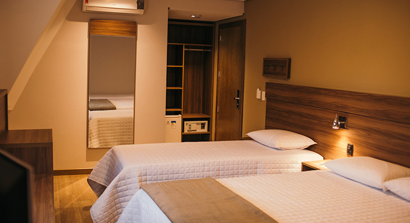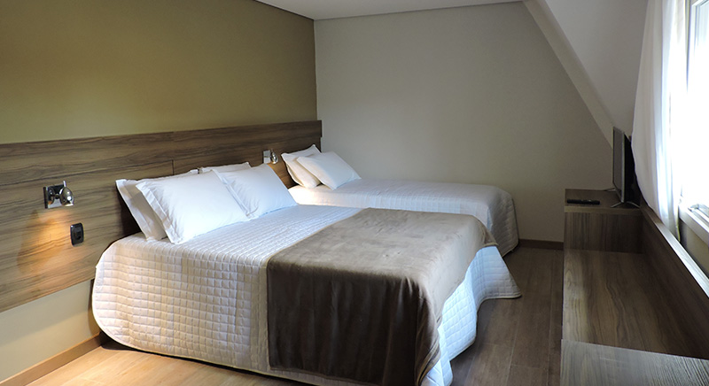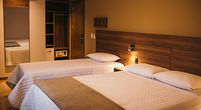 O quarto Triplo Luxo acomoda até três pessoas em uma cama de casal e uma cama de solteiro com o máximo conforto, além de permitir adição de berço gratuitamente, mediante solicitação.
